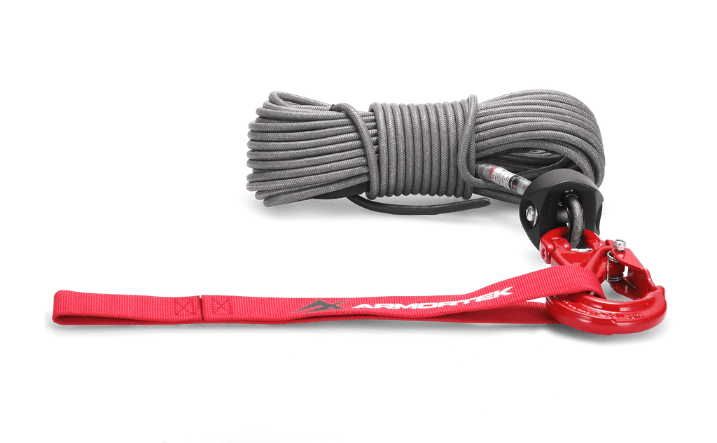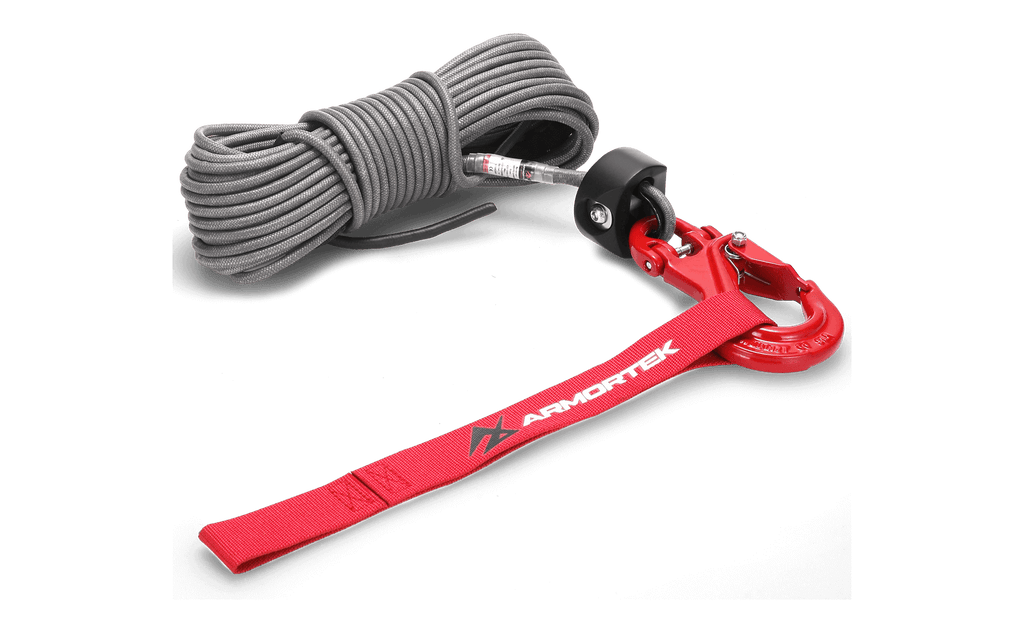 This complete winch rope kit includes a high-strength 13/64" x 50' (5mm x 15m) Armortek Extreme Synthetic Rope, a heavy-duty hook, a rope stopper, and a handsaver strap, giving you everything you need for safe and reliable winching.